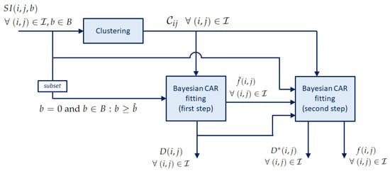 The whole procedure is sketched in Figure 1. The clustering processes the signal intensity to determine the clusters , which are used in the next steps to estimate the weights in the CAR prior specification. The input of both steps of the Bayesian CAR fitting are thus the output of the clustering, together with the signal intensity itself. The first step produces the coefficients and , which are passed as input to the second step. The second step produces the coefficients and .