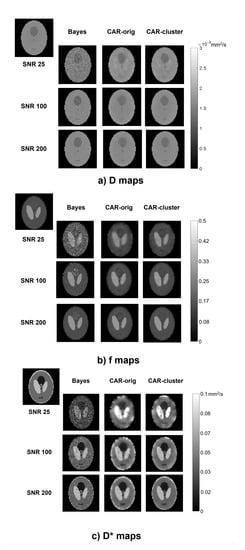 Recently, approaches based on deep neural networks (DNNs) have been introduced to estimate IVIM parametric maps [,,]. In these works, it was reported a higher quality of the maps compared to those estimated using traditional least squared and Bayesian methods. Specifically, Kaandorp et al. [] stated that an optimized DNN can improve IVIM estimation for tissues with low perfusion and on images with low , and generate less noisy maps with more robust estimation over neighbor voxels. In our work, we have not compared our method with DNN-based approaches; however, we are confident that our results are in line with those reported in [,,]. In fact, thanks to the introduction of a spatial dependency through the CAR prior specification, the continuity between adjacent voxels that share the same diffusion and perfusion properties was guaranteed. Furthermore, our estimation accuracy was high even at very low , probably comparable with that obtained by DNNs (a direct comparison is not possible, as different setups and simulations were adopted).