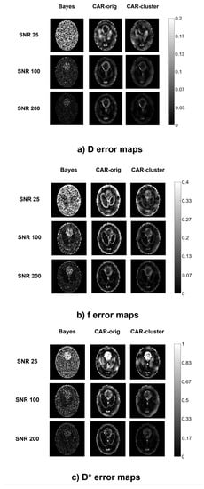 The error maps reported in Figure 3 make it evident that the high errors at the boundaries of the structures in the CAR maps were almost completely eliminated with the clustering approach, especially for high values. In addition, it can be seen from the maps that, in both CAR approaches, values were highly dependent on the IVIM coefficient values (i.e., some specific triplets were more difficult to be estimated), whilst the Bayesian method without CAR seemed less dependent. In particular, it showed for D the same error level throughout the whole image.