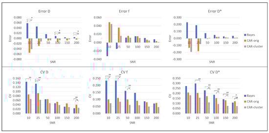 Figure 4 shows for each the barplots of and averaged on the simulated images with the corresponding significance, while the detailed results for each specific simulation are reported in the Supplementary Materials Tables S1–S4. Similar trends of and can be observed for the three methods, with higher values at low that decrease at high , as expected. The accuracy was generally higher under the proposed approach with clustering as regards the estimation of D and f: on D presented an averaged reduction of 46% compared to the other approaches, which was significant for , and ; on f reduced of 21% compared to the Bayesian approach without CAR and of 34% compared to the CAR without clustering, although this was not statistically significant. As for , similar errors were obtained for both CAR approaches, lower than for Bayesian approach without CAR (non-significant reduction of about 58%). was always the lowest for the proposed approach with the clustering, for each IVIM coefficient and value. Specifically, the introduction of clustering reduced the of about 25–55% compared to traditional Bayes, and of about 30% compared to the original CAR approach. Furthermore, for maps at low , the two CAR approaches presented similar s, and a significant reduction was found only between the original Bayesian approach without CAR and the CAR with clustering. On the contrary, for high the original CAR without clustering and the traditional Bayesian approach were almost comparable, whilst the introduction of clustering significantly reduced the compared to both of them; therefore, the CAR with clustering was able to improve not only the quality of the maps, especially on the boundaries of the structures, but also the estimation of the IVIM coefficients with respect to the other methods.