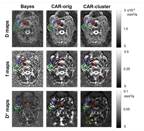 Parametric maps of D (first row), f (second row) and (third row), estimated from a selected slice of a HN patient using the three methods (columns). The tumor, the parotid gland and the masticatory muscle are delineated in red, green and blue, respectively. Red arrows indicate improvement in boundary definition, yellow arrows indicate reduced blurred effects.