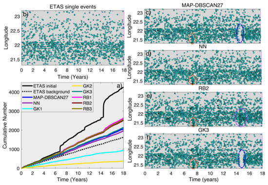 (a) Cumulative number of background events for each algorithm, the initial ETAS catalog with black color and the mother events of the ETAS synthetic catalog with the black dotted line. The space-time evolution (b) of the initial ETAS catalog and of the background seismicity for the four best algorithms, (c) MAP-DBSCAN27 (), (d) NN (), (e) RB2 (), (f) GK3 (). Colored ellipses stand for large gaps and significant concentration of events.