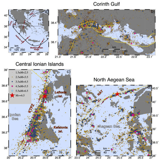 We considered three areas in the region of Greece (Figure 2a), which consist of distinctive seismotectonic units. The selection of the three study areas is based on criteria related to the homogeneity of the type of faulting, the comparatively intense continuous seismicity and the existence of seismic excitations during the study period. The first area, Corinth Gulf (CG) (Figure 2b), is undergoing high extensional deformation rates. The seismicity is mainly associated with eight major faults that bound the rift to the south and dip to the north [48]. The area of central Ionian Islands (CII) (Figure 2c) is characterized by the highest moment rate in the Mediterranean region. Its main seismotectonic feature is the Kefalonia Transform Fault Zone (KTFZ) which extends for more than 100 km along the western coastlines of Lefkada and Kefalonia Islands, comprising two distinct main branches, the Lefkada and Kefalonia faults, respectively. Right lateral strike slip motion with a minor thrust component is the dominant faulting type [49,50]. The third area is located in the North Aegean Sea (NAS) (Figure 2d) and is dominated by dextral strike-slip faulting, along the North Aegean Trough (NAT) and its parallel branches [51], as a consequence of the westward propagation of the North Anatolian Fault into the Aegean [52]. The driving mechanism of the active deformation in the Aegean region is the subduction of the oceanic lithosphere of the Eastern Mediterranean under the continental Aegean microplate, forming the Hellenic Subduction Zone and the extensional back arc Aegean area due to the slab rollback [53].