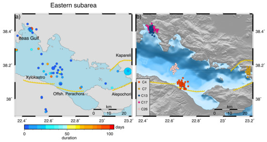 The eastern subarea is characterized by more sparse activity. A major seismic sequence, Offshore Perachora ( in Figure 5b), is detected, including two sub-sequences, the first initiated on 22 September and the second on 30 September 2012 (Figure S6). Two relatively large clusters, and , are observed near Itea; the former lasted almost two weeks at the end of March, 2014, and the latter—almost three months between August and October 2014 (Figure 5 and Figure S7).