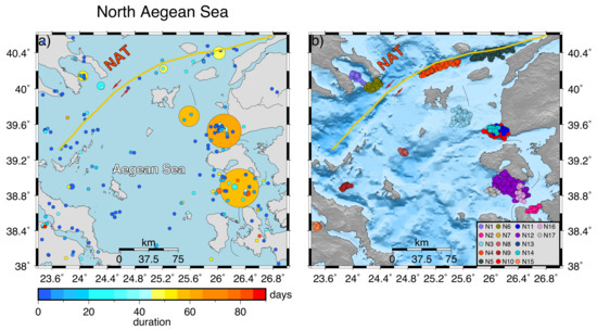 (a) Spatial distribution of the centroids of the identified clusters for the area of North Aegean Sea along with the trace of North Aegean Trough (yellow lines). The size of the circles is proportional to the earthquake number in each cluster, whereas the duration is represented by the color scale. (b) Spatial distribution of the clusters with events. The index of each cluster is given in the inset box.