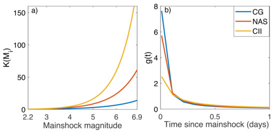 (a) The number of events triggered by an earthquake of magnitude at CG (blue), NAS (orange) and CII (brown), respectively. (b) The temporal distribution of triggered aftershocks.