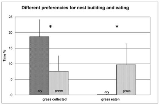 The percentage of time spent collecting or eating from either the green or dry grass by naive primiparous domestic rabbit females (N = 7) during the one-hour observation period. Asterisks indicate significant differences (p < 0.05) in Wilcoxon matched-pairs signed-ranks tests.
