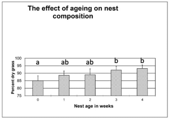The effect of ageing on the estimate of grass dryness was tested by repeatedly analysing the composition of stored nests for four weeks (Figure 2). Although the original ratio of 85% had been gradually increased to 91% by the end of the 4th week, only the change between the first and the last two weeks was significant by the Dunn test (alpha = 0.05) following Friedman nonparametric ANOVA for repeated measures (Fr = 18.38, N = 7, p < 0.01).