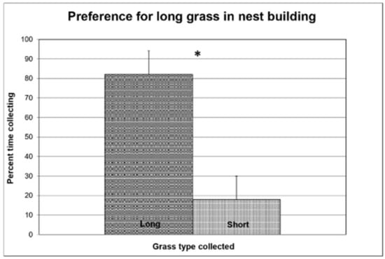 The relative percentage of time spent in collecting from either long (30 cm) or short (10 cm) grass by rabbit females (N = 7). Asterisks indicate significant differences (p < 0.05) in Wilcoxon matched-pairs signed-ranks tests.