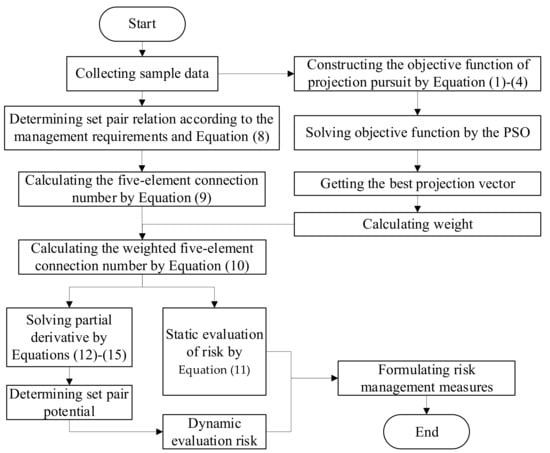 The risk assessment model proposed in this paper is mainly divided into five parts: (1) data collection, (2) calculating the objective weights based on the PP optimized by PSO, (3) determining the set pair model according to the risk management, (4) static analysis based on the confidence, and (5) dynamic analysis based on the set pair potential.