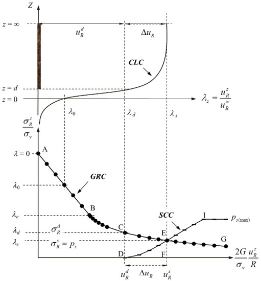 The convergence-confinement method (CCM) adopts the assumption of the plane strain and is used to simulate the interaction between support and ground of a circular tunnel, and can analyze the displacements/stresses generated around the tunnel. This method is an effective calculation method for designing underground excavation support and consists of a combination of three different curves [1,2,3]. As shown in Figure 1, there is the longitudinal displacement profile (LDP) or a so-called confinement loss curve (CLC), the support confining curve (SCC), and the ground reaction curve (GRC). Numerous publications discuss the CCM and its use in predicting and applying underground excavation, and behavioral analysis of supporting structures [4,5,6,7,8,9]. For design considerations and applications, the method becomes an initiation tool for the supports design of tunnel excavation [10,11,12,13]. As shown in Figure 1, the curve ABCEG represents the GRC, as the tunnel continues to excavate, the surrounding rock stress decreases, and the radial displacement increases gradually. Therefore, this curve determines when the support is installed and the stiffness of the support plays an important role [14,15,16,17]. Numerous studies have been investigating this approach, using empirical and mathematical expressions to develop GRCs under different behavioral assumptions and generally applicable to tunnels excavated in isotropic stress state [18,19,20,21]. The curve DEI denotes the SCC that characterizes the deformation imposed on the support and its ability to withstand the radially converging pressure (point D) that has occurred since the support was installed. There are many studies on SCC that focus on the transient conditions of supports, progressive hardening, time-dependent properties, and non-linearities [5,6,15,19,22,23,24]. Numerous studies have explored the analytical solutions of SCC and GRC at equilibrium (point E) under different hypotheses [25,26,27,28].