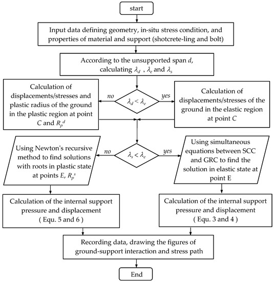 The algorithmic process used in the analysis of DCM is to solve the displacement/stress at the equilibrium state (point E). The computation flowchart of DCM is represented in Figure 2. The process and steps of the calculation performed by DCM include (1) input of calculation data (including tunnel geometry, in situ stress, surrounding rock material, support member material, unsupported span, and other related parameters), (2) according to the unsupported span calculate the value of λd, λe, and λs, (3) determine whether the stress change of surrounding rock (i.e., the corresponding λ value) caused by the continuous excavation of the tunnel is in the elastic zone or in the plastic zone, (4) according to Equations (3)–(6), calculate the solution at the equilibrium point, and (5) record the displacement/stress corresponding to all incremental values and plot the graphs or tables.