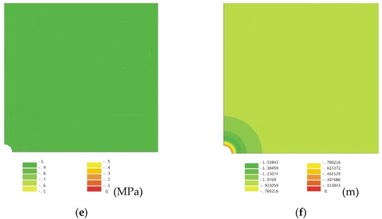 Simulation results of a circular tunnel excavation calculated by finite element analysis. (a) the stress field, (b) the plastic zone, (c) the major principal stress, (d) the minor principal stress, (e) the initial stress, and (f) the total displacement.