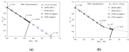 According to the results obtained by FEM and DCM for the support–ground interaction, the displacement/stress at the equilibrium state is different in the elastic region (Figure 4a) and the plastic region (Figure 4b). From the comparison results, it can be found that the mobilized support pressure in the elastic zone shows a relatively high value, while the radial displacement indicates a lower value, but the situation in the plastic zone shows the opposite. Furthermore, it must be noted that the trajectory of the support–ground interaction follows the ground reaction curve so, in this case, the interaction curve (IC) and the ground reaction curve (GRC) coincide with each other, i.e., the isotropic stress field.