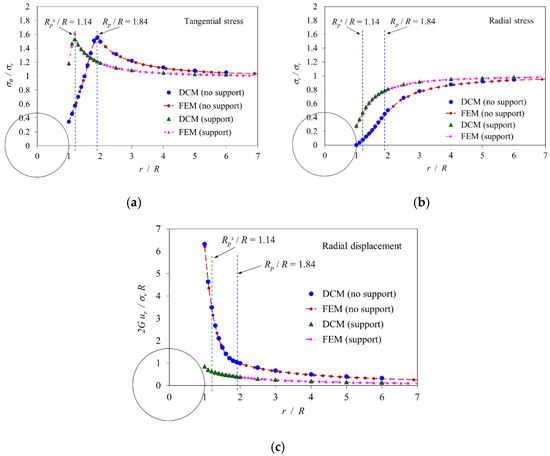 Distribution of the displacement/stress around a circular tunnel proximity under the support and no support condition by the comparison results obtained between FEM and DCM. (a) the tangential stress (σθ), (b) the radial stress (σr), and (c) the radial displacement (ur).