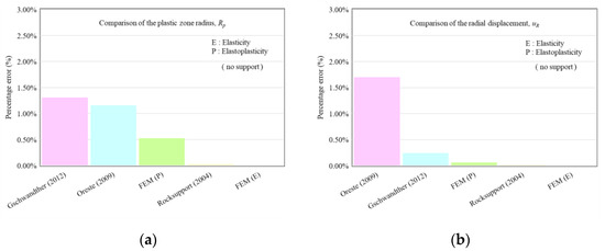 Percentage error of results between DCM and other studies under no support condition. (a) the plastic zone radius (Rp), and (b) the radial displacement (uR).