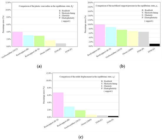 Percentage error of results at the equilibrium state between DCM and other studies under the support condition. (a) the plastic zone radius (), (b) the mobilized support pressure (), and (c) the radial displacement ( ).