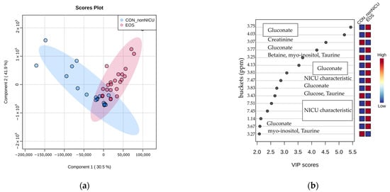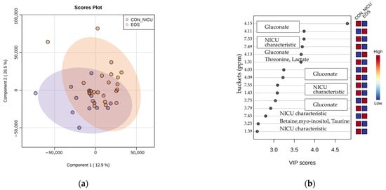 Multivariate analysis of NMR data belonging to neonates diagnosed with EOS (orange circles) and neonates hospitalized in NICU without EOS (purple circles). (a) PLS-DA scores plot of the EOS and control group. (b) VIP scores and metabolites related to buckets with different concentration among the two groups.
