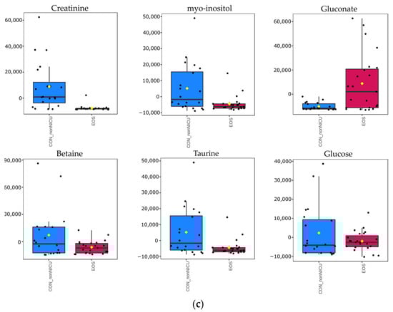 A univariate statistical analysis was performed on specific metabolites with discriminant peaks. Metabolites with p-value < 0.05 (Table 2) were characterized as statistically significant. Between septic and healthy non-NICU preterms, additively to multivariate results, lactose and hippurate were highlighted as significant for EOS, and dimethylglycine for LOS group. For both septic groups decreased levels of taurine, betaine and increased levels of gluconate also shown by multivariate analysis were reinforced by univariate analysis. EOS and LOS metabolites’ comparison confirmed the initial results obtained through multivariate analysis regarding myo-inositol’s differentiation. Septic groups and control NICU preterms did not highlight any statistically significant metabolite. The box plots of the statistically significant metabolites represent the differentiation of their relative intensity between septic and healthy control non-NICU neonates (Supplementary materials Figure S8).