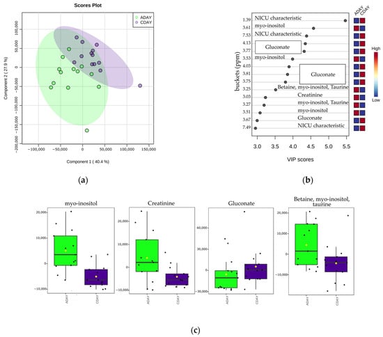 Multivariate analysis of NMR data belonging to urine samples of neonates diagnosed with EOS the first (green circles) and the third day (blue circles) of their life. (a) PLS-DA scores plot of the first- and third-day’s samples. (b) VIP scores and metabolites related to buckets with different concentration among the two groups. (c) Box plots of normalized concentration for the discriminant metabolites.