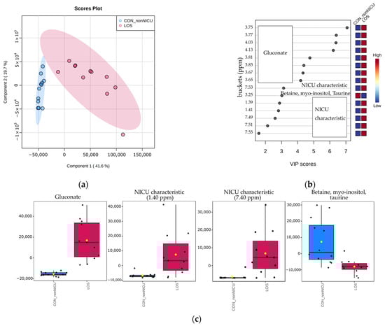 Multivariate analysis of NMR data belonging to neonates diagnosed with LOS (pink circles) and control neonates without need for hospitalization (blue circles). (a) PLS-DA scores plot of the LOS and healthy non-NICU preterms without need for hospitalization. (b) VIP scores and metabolites related to buckets with different concentration among the two groups. (c) Box plots of normalized concentration for the discriminant metabolites.