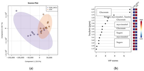 Multivariate analysis of NMR data belonging to neonates diagnosed with LOS (orange circles) and control neonates of NICU (blue circles). (a) PLS-DA scores plot of the LOS and control. (b) VIP scores and metabolites related to buckets with different concentration among the two groups.