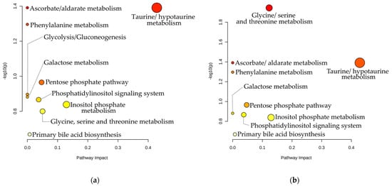 The identified significant metabolites from multivariate and univariate analysis were implemented into MetaboAnalyst pathway analysis module to determine a qualitative aspect of all the possibly affected metabolic pathways. A separate analysis for the EOS and LOS group was selected, as except myo-inositol, betaine, gluconate, taurine, lactose, creatinine and hippurate which were statistically significant for both groups, glucose and N, N-Dimethylglycine were characterized as significant only for EOS and LOS group, respectively. A metabolic pathway analysis depicted ten (n = 10) altered metabolic pathways for the EOS (Figure 8a, Supplementary materials Table S2) and nine (n = 9) for the LOS group (Figure 8b, Supplementary materials Table S3). The representation of all the identified pathways was based on the pathway impact (x-axis) and the calculated p-value (y-axis). Among the nine metabolic pathways for EOS, ascorbate/ alderate metabolism and taurine/hypotaurine metabolism were the most significant, with p-value < 0.05. Taurine/hypotaurine metabolism pathway had the largest impact factor (0.42), followed by inositol phosphate pathway (0.13). Myo-inositol and taurine were the metabolites involved in these pathways (Supplementary materials Table S2). Regarding the LOS, significant metabolites, glycine/serine, and threonine metabolism pathway, where betaine and N,N-Dimethylglycine are involved, had the lowest p-value (0.01). The pathway impact scores did not present large differences from EOS pathway analysis.