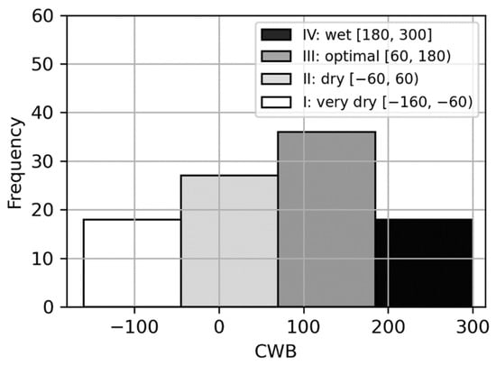 Based on those calculated for each year, the Climatic Water Balance (CWB) results distribution histogram was evaluated (presented in Figure 1). The histogram was split into four categories of CWB: very dry [−160 to −60), dry [−60 to 60), optimal [60–180), and wet [180–300). Each CWB range corresponds to the descriptions of the given growing season, and the resulting split is presented in Table 2.