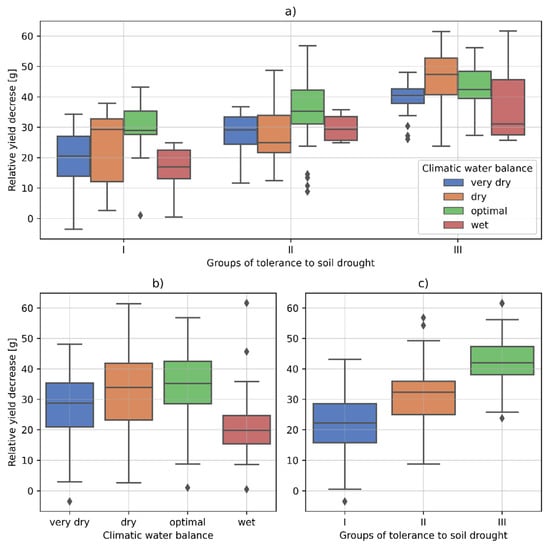 Descriptive statistics for the measured relative yield decrease concerning: (a) climatic water balance classes, (b) decrease for cultivar groups of tolerance to soil drought, and (c) for cultivar groups of tolerance to soil drought and climatic water balance classes.