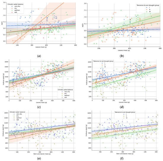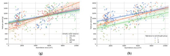 Linear modeling results for relation between agronomic parameters against categories: climatic water balance or against tolerance to soil drought group, presented for parameters sets: (a) & (b) leaves mass and MSTI, (c) & (d) leaves mass and yield per plant, (e) & (f) stem and leaves mass and yield per plant, (g) & (h) assimilation area and yield per plant.