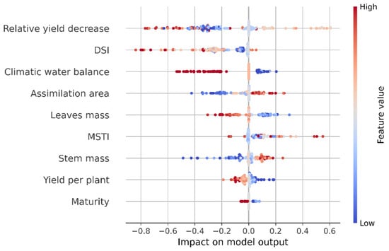 The final classifier for the groups of potato varieties’ tolerance to soil drought, which uses extreme boosting, is a form of the extended decision trees method, and its eventual answer is based on an analysis of several features. Figure 4 allows one to investigate how this classifying decision is taken. The presented graph, generated using the method presented in Reference [], allows one to follow what is the individual input feature’s impact on the model output regarding those feature values. In addition to the feature importance values for the final model, which are listed in Table 6, this method lets one deeper interpret the model features.