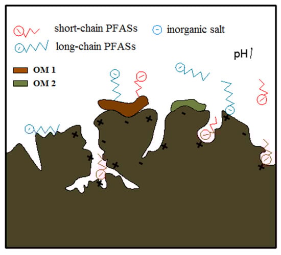The main adsorption mechanism of carbon materials was hydrophobic and electrostatic effects, as well as possible hydrogen bonds and covalent bonds effects [4]. The hydrophobic effect would be improved with an increased C-F chain length; thus, long-chain PFASs were better adsorbed than short-chain congeners. Meanwhile, the removal efficiency of adsorbents for PFASs was also depended on the terminal functional groups; for instance, the removal efficiency of PFSAs was better than PFCAs. In addition, the electrostatic attraction could occur between the anionic PFASs and positive charge adsorbents. Therefore, the changes of ionic strength involving cations or anions and pH in the solution would influence the adsorption efficiency. For example, the increase of ionic strength caused by monovalent or divalent cations (Na+, K+, Ca2+, etc.) might enhance PFAS removal efficiency, while the pH increase would reduce the adsorption capacity of most adsorbents [31,32]. However, the electrostatic repulsion between anionic PFASs and a negatively charged adsorbent could be overcome by the hydrophobic effect of the C-F chain [33]. Therefore, the removal of short-chain PFASs was mainly dependent on the electrostatic effect, while long-chain PFASs mainly tended to hydrophobic effects. Adsorption mechanisms of carbon-based adsorbents for PFASs removal are shown in Figure 1.