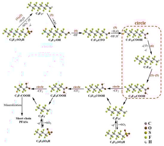 The degradation of PFASs on the electrode surface was related to electron transfer and free radical oxidation; the proposed pathways for electrochemical oxidation of PFOS in water are shown in Figure 3.