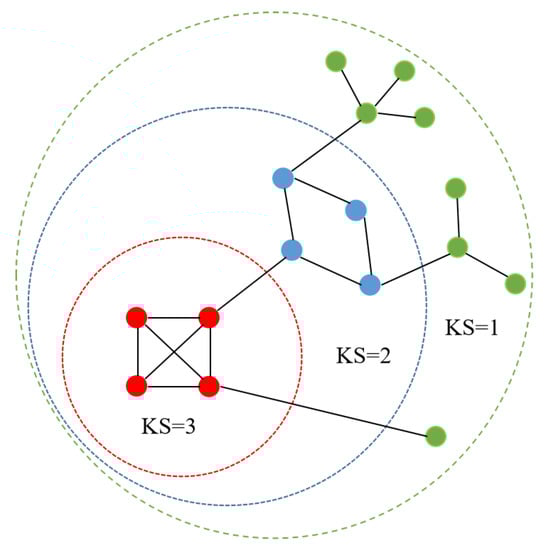 The k-shell decomposition method divides the network into substructures directly related to degree centrality []. In this approach, the network is described as a hierarchical structure, revealing the complete hierarchy of its nodes. In Figure 1, the innermost nodes belong to a structure called the core, while the rest of the nodes are placed in more external layers (called k-shells).