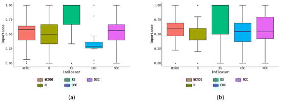 According to Equation (13), we can obtain the 49 nodes’ importance composite scores’ MCNDI. We simulated the node importance of the Chesapeake Bay network and the contiguous USA network using the integrated indicator and compared the results with those obtained using a single indicator to measure node importance, the results of which are shown in Figure 3. In Figure 3, the abscissa represents the sequence number distribution of nodes, and the ordinate represents the normalized value of the importance score of nodes under the current evaluation indicator. We show the distribution of node importance ranking normalized by box plots in Figure 4.