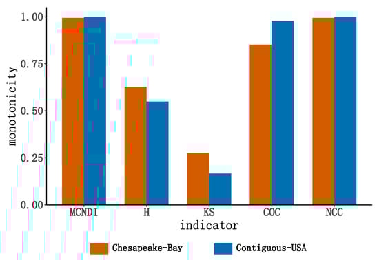 In Equation (16), represents the number of nodes with the same indicator evaluation score; represents the number of candidate nodes selected from the network with a ratio of p for ranking; and Monotonicity fluctuates in the range , which represents the proportion of nodes with the same index value to the set of candidate points. The higher the monotonicity of the node importance index in the network, the more accurate the identification of the importance of different nodes; conversely, the lower the monotonicity of the node ranking, the poorer the granularity of the metric for identifying different nodes. We chose p = 1, i.e., the monotonicity was calculated separately for the whole network of the Chesapeake Bay network and the contiguous USA network. The results of the monotonicity calculation are shown in Figure 5. According to the simulation results, it can be found that the monotonicity of the node importance ranking of MCNDI is closer to 1 in both networks, so in comparison with the single indicator, the integrated indicator MCNDI has better monotonicity, which tends to improve the accuracy of the node importance ranking. It should be noted here that the monotonicity may not necessarily remain 1 for the multi-attribute composite indicator because there may be structurally symmetric nodes in the real network.