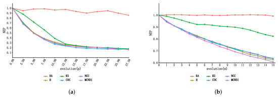 Comparing Figure 7a with Figure 7b, we found similar network changes. According to the changes of the node network efficiency ratio, the network efficiency ratios of different networks all decrease rapidly under the MCNDI indicator attack, reflecting the stability of MCNDI’s assessment of the importance of nodes in different networks, while the other indicators are affected by the network topology, and there are large fluctuations in the ability to influence the network efficiency ratio. The reason for the difference between the two figures is the different topology of the network, so the importance of the distribution of the nodes is also different, and the attack using MCNDI can cause good effects on them all, indicating that the composite indicator is a more accurate and generalized measure of network importance.