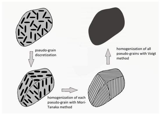 The elastic properties of the material are obtained using a two-step micromechanics homogenization algorithm. Firstly, all of the inclusion families were homogenized separately as a composite material with two phases following the MoriβTanaka homogenization scheme []. Secondly, all pseudo grains were homogenized to a single composite by adopting a Voigt homogenization approach, which is schematically depicted in Figure 1 and in mathematical form can be described by , where is the homogenized stiffness tensor, and is the stiffness tensor of the pseudo grain i with volume fraction . In case of a two-phase composite material such as a glass fiber reinforced polymer (GFRP) with unidirectional long fibers, the two-step method coincides with the simple MoriβTanaka method. The homogenized stiffness tensor is given from the MoriβTanaka formula:
