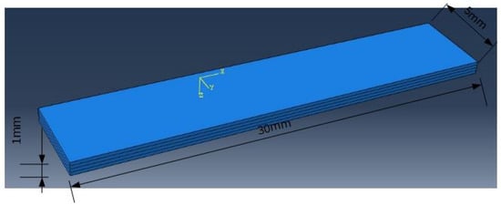The model material geometry is represented by a domain between two adjacent cracks that is undamaged and has a 30 mm length. Every layer has a 0.25 mm thickness value and the composite is loaded uniaxially. Tabular data are employed for the incremental application of the strain up to a total value of 1.5% using a loading duration of 270 s. The geometry of the model is depicted in Figure 3.