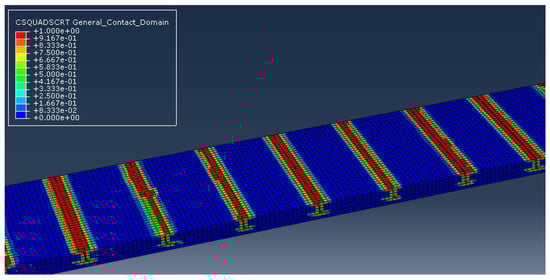 In Figure 5, the calculated quantity denotes the criterion for damage initiation for the quadratic contact stress. If = 1, the criterion is fulfilled. It should be stressed that the value cannot exceed 1 so as to specify damage evolution. For CZM, damage progression is manifested by the reduction of stiffness of the cohesive contacts, whereby, in the case of cohesive elements, damage propagation corresponds to stiffness degradation for the material itself. The present work is adopted based on energy criteria, following the analytical forms proposed by Benzeggagh and Kenane []. The aforementioned forms are useful in cases where the critical energies become equal during separation along the two shear directions () and