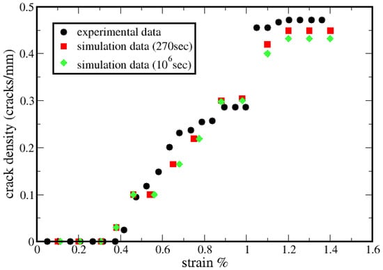 Crack density as a function of strain for experiment data [] and simulation model data for quasi-static loading and for total loading time of about 270 s.