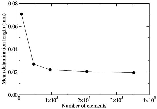 The cross-ply composite model was solved for five different meshes to examine the mesh dependency having 8000, 45,144, 96,000, 208,306, and 352,688 continuum shell elements, respectively, and the results are shown in Figure 8. It can be concluded for all four models that the cracking saturation occurs with the same number of cracks. The only result that significantly differentiates in coarse meshes and seems to stabilize as the mesh becomes finer is the mean delamination length (Figure 9). This result is calculated as an average value from the sum of the delamination length of each crack divided by the number of cracks.