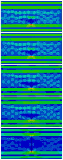 In Figure 10, a cross-ply composite RVE model (with characteristics as mentioned in Section 3) is constructed and loaded in uniaxial tension that is applied through Dirichlet-type boundary conditions by using the strain results of the macroscale model. The cracking propagation simulated with XFEM is shown as the loading increases. In particular, as the crack propagates, the stress in the middle layer reduces while stress concentration in the crack tips is evident, in agreement with the macroscale model. In Figure 11, the stress concentration values at the crack tips are compared against the simulation predictions of microscale and macroscale models.
