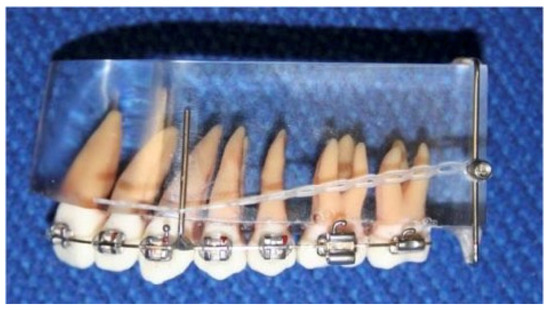 A photoelastic model of the left maxillary dentition was used for this study. The model was created as follows. Epoxy anatomical teeth models (Anatomical Tooth Model, B2-306, Nissin, Kyoto, Japan) were used as artificial teeth. To reproduce normal occlusion during treatment, pre-adjusted edgewise brackets with 0.018-inch slots were bonded to the facial axis point, which is considered to be the appropriate bracket position [19,20] of each artificial tooth, and a 0.017 × 0.025-inch stainless steel archwire was inserted and fixed to the brackets with elastic chains. This was the model representing normal occlusion after orthodontic treatment. An alveolar wax form with an actual width of 10 mm of the left maxillary dentition was fabricated to match the model. An impression was made using polyvinyl siloxane. The impression material was removed from the alveolar wax form area, and epoxy resin (Devcon ET-300, ITW performance polymer, Osaka, Japan) was poured into the area to create an elastic model. As a result, a photoelastic model consisting of a bracket, wire, and alveolar bone made of epoxy resin and teeth was fabricated (Figure 1).