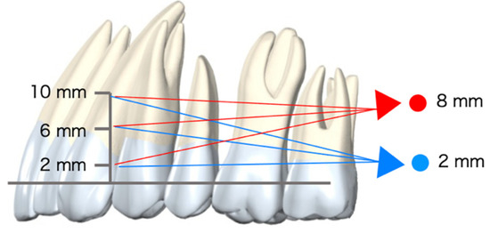 An elastic chain was attached from the retraction hook to the posterior anchor, and stress of 200 g was applied (Figure 1). There were six combinations with three retraction hook lengths (2 mm, 6 mm, and 10 mm) and two posterior anchor positions (2 mm and 8 mm from the maxillary first molar cervical region) (Figure 2).