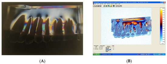 The stress distribution and strength measurement around the tooth roots were carried out with each combination (hook length and posterior anchor) using a digital photoelastic strain measurement system (GFT1400 Stress Photonics, Madison, WI, USA). In the conventional analog photoelastic method, the stress patterns that appear as fringes or bands of color are evaluated by visual observation (Figure 3A). However, the newer and superior digital photoelastic method can analyze these fringes quantitatively (Figure 3B). The system includes a set of software tools that are used to make measurements reliably and accurately.
