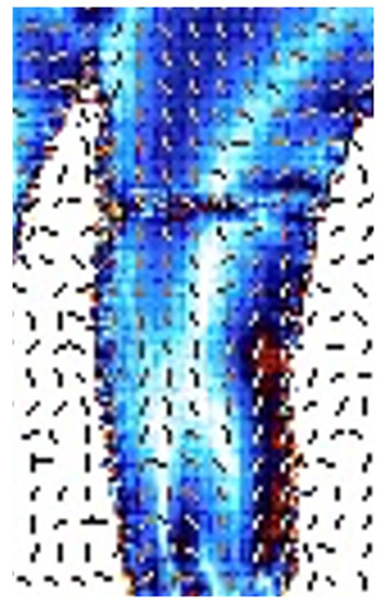 Stress direction analyzing image indicating the stress direction as vertical to each dash. The blue area shows photoelastic resin and white area shows tooth root.