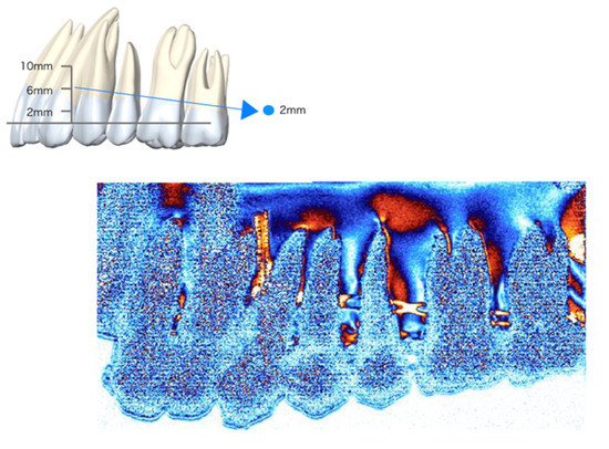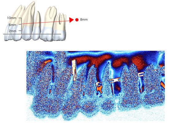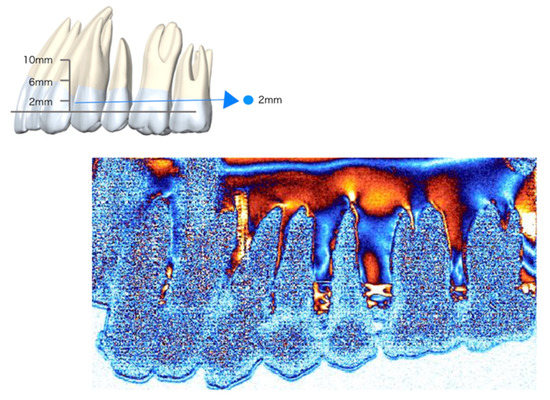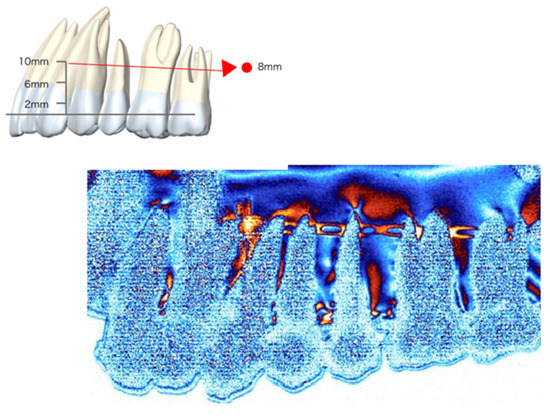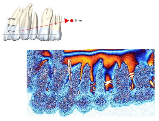 In this study, we calculated the compressional, tensional stress, and stress direction around the tooth root during the distalization of maxillary dentition with a skeletal anchorage using the novel digital photoelastic method to improve our understanding of the movement of individual teeth, including the roots. The study mainly assumed a plate-type anchor [6,21], which can retract from any position in the vertical dimension, or a miniscrew implant anchor, whose placement position is limited by the inter root space [22,23], as the retraction position, and the height was adjusted accordingly. As a result, compressive stress was observed in the distal direction around the interarticular septum throughout the dentition for all six combinations of retraction hook lengths and posterior anchor positions. In addition, the stress direction and stress strength change were observed due to the difference between the length of the retraction hook and the position of the posterior anchor, especially in the apical region.