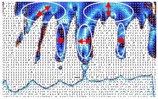 The stress direction was similar for all combinations of anchor position and hook length. In the apical area of the six anterior teeth, the stress direction was oblique. Between the premolar and molar roots, the stress direction was horizontal. In the apical region of the molars, the model showed that the direction of stress was vertical (Figure 11). A pattern emerged from anterior to posterior: oblique to horizontal to vertical.