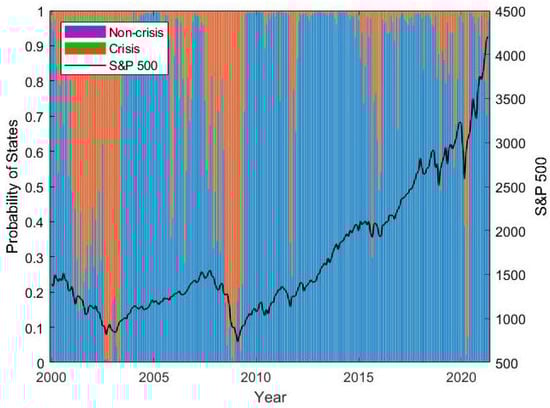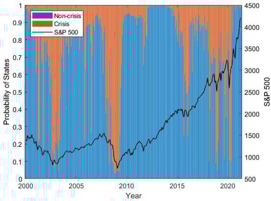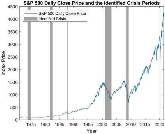 In our application, the examined index time series consists of the daily closing prices of the S&P 500 index from 1 January 1971 to 31 May 2021. The S&P 500 index and the determined crisis periods based on the described method are shown in Figure 1. Specifically, six crisis periods are identified: 20 November 1973 to 6 December 1974 (1973 oil crisis), 24 August 1981 to 12 August 1982 (early 1980s recession), 15 October 1987 to 4 December 1987 (Black Monday), 12 December 2000 to 11 March 2003 (burst of the dot-com bubble), 21 May 2008 to9 March 2009 (global financial crisis) and 5 March 2020 to 23 March 2020 (COVID-19 crisis). The identified crisis periods match the crises recognized universally by economists and the public and are considered a reasonable representation of the true crisis periods.
